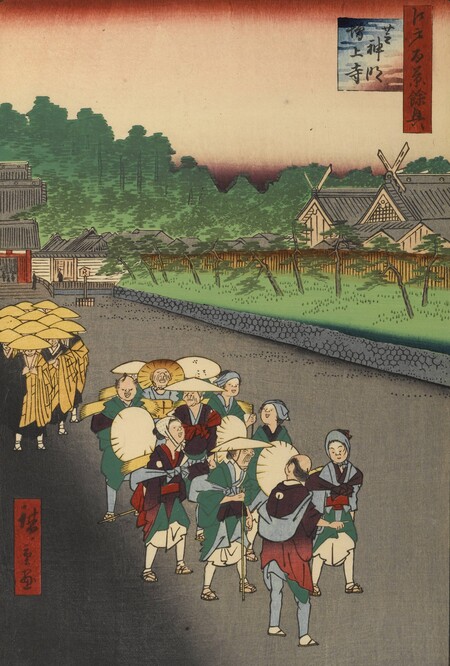 Святилище Сиба Симмэй, монастырь Дзодзёдзи в Сиба. «100 знаменитых видов Эдо». Утагава Хиросигэ; Мост Инари-баси в Тэпподзу, святилище Минато-дзинд. Серия «100 знаменитых видов Эдо». Утагава Хиросигэ.