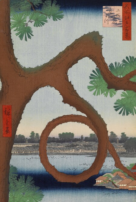 Святилище Мотохатиман в Сунамура. «100 знаменитых видов Эдо». Утагава Хиросигэ; Сросшиеся камфарные деревья у святилища Адзума-но мори. Серия «100 знаменитых видов Эдо». Утагава Хиросигэ.