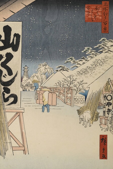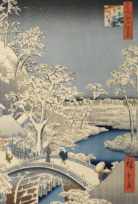 Заснеженный мост Бикунибаси. «100 знаменитых видов Эдо». Утагава Хиросигэ; Местность Сусаки и Дзюманцубо в Фукагава. Серия «100 знаменитых видов Эдо». Утагава Хиросигэ.