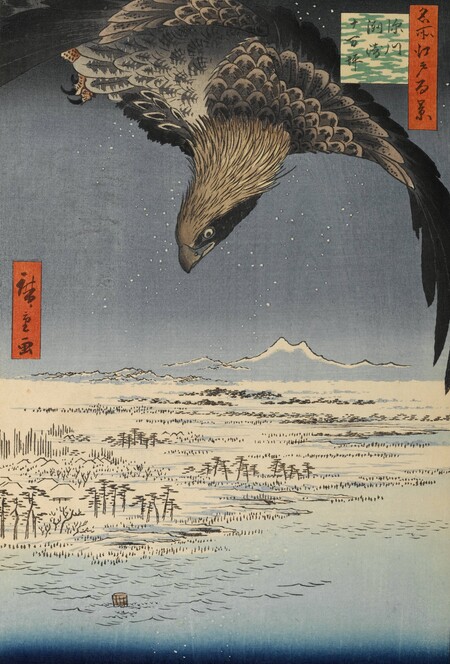 Отмель в Сусаки. «100 знаменитых видов Эдо». Утагава Хиросигэ; Лунная сосна на территории монастыря в Уэно. Серия «100 знаменитых видов Эдо». Утагава Хиросигэ.