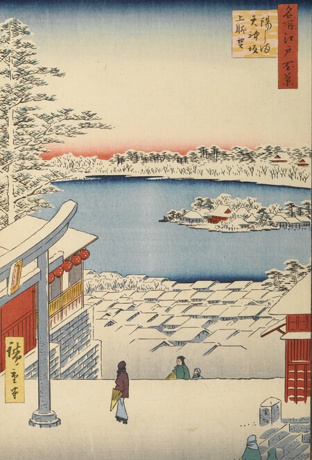 Святилище Бэнтэн на пруду Инокасира-но икэ. «100 знаменитых видов Эдо». Утагава Хиросигэ; Территория святилище Акиба в Укэти. Серия «100 знаменитых видов Эдо». Утагава Хиросигэ.