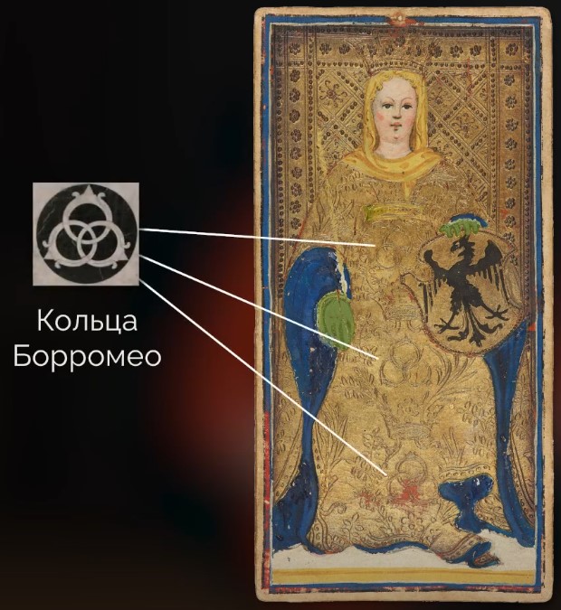 Карты «Паж», «Рыцарь», «Королева», «Король» и «Император» иллюстрировали феодальную структуру общества. Изображения были портретными, часто с реальными гербами и символами власти (как на карте «Император» из колоды Висконти-Сфорца, где он держит скипетр и орла — имперские инсигнии).