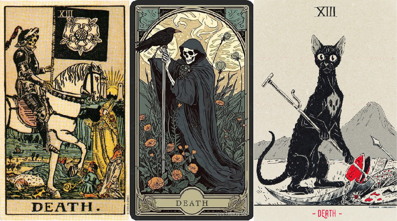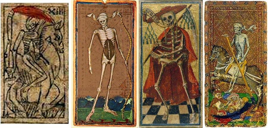 Сравнение карт «Смерть» 1)Итальянское таро середины 15 века 2)Таро Visconti-Sforza, ок.1460 3)1 из 4 карт из музея Виктории и Альберта 4)Колода Cary-Yale Visconti 5) Колода Артур Уейт 6-7)Современные