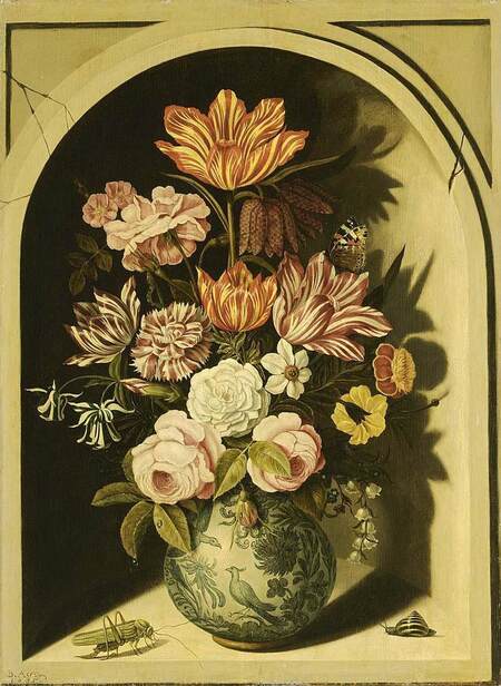 Слева: Бартоломеус Абрахамс Асстейн. Натюрморт с цветами, ракушками и лягушкой. 1631. Справа: Бальтазар ван дер Аст. Натюрморт с цветами. 1625-30.