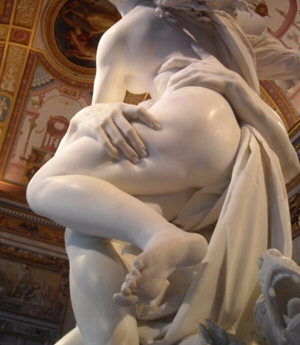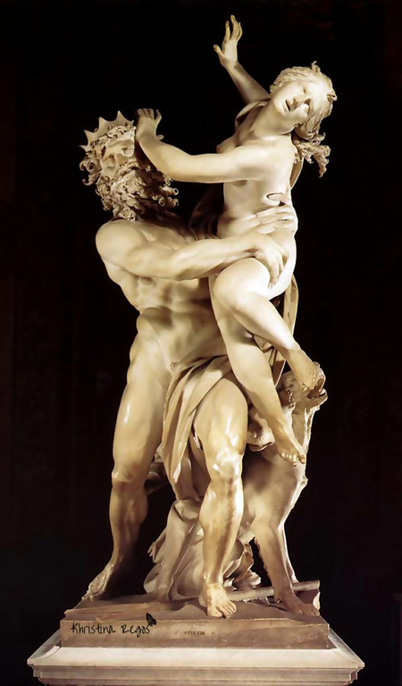По сюжету древнегреческого мифа, Плутон влюбился в Прозерпину с первого взгляда. и сразу же захотел украсть ее в Подземное царство и сделать своей женой. Девушка, в свою очередь, не была согласна на такой шаг и всеми силами пыталась вырваться из рук повелителя Царства мертвых. Бернини восхитительно уловил динамику и экспрессивность персонажей в данной сцене: чего только стоит воздушность тела Прозерпины, контрастирующая с суровой хваткой Плутона.
