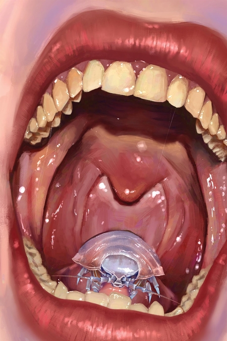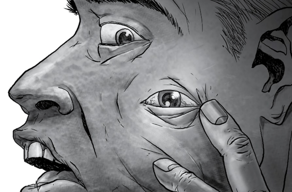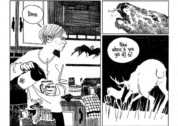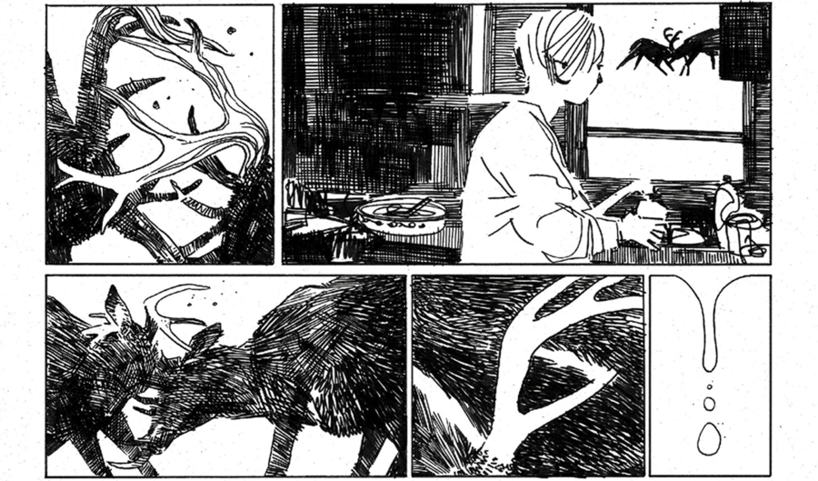 В Excerpt from «Sleeping stories» страх рождается на границе между избытком визуального шума и почти полной пустотой страницы. Огромные чёрные участки кадра создают ощущение потерянности, зритель видит лишь фрагменты тела монстра, отдельные зубы, локальные вспышки света.