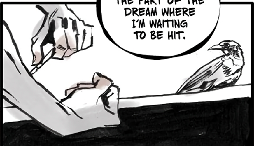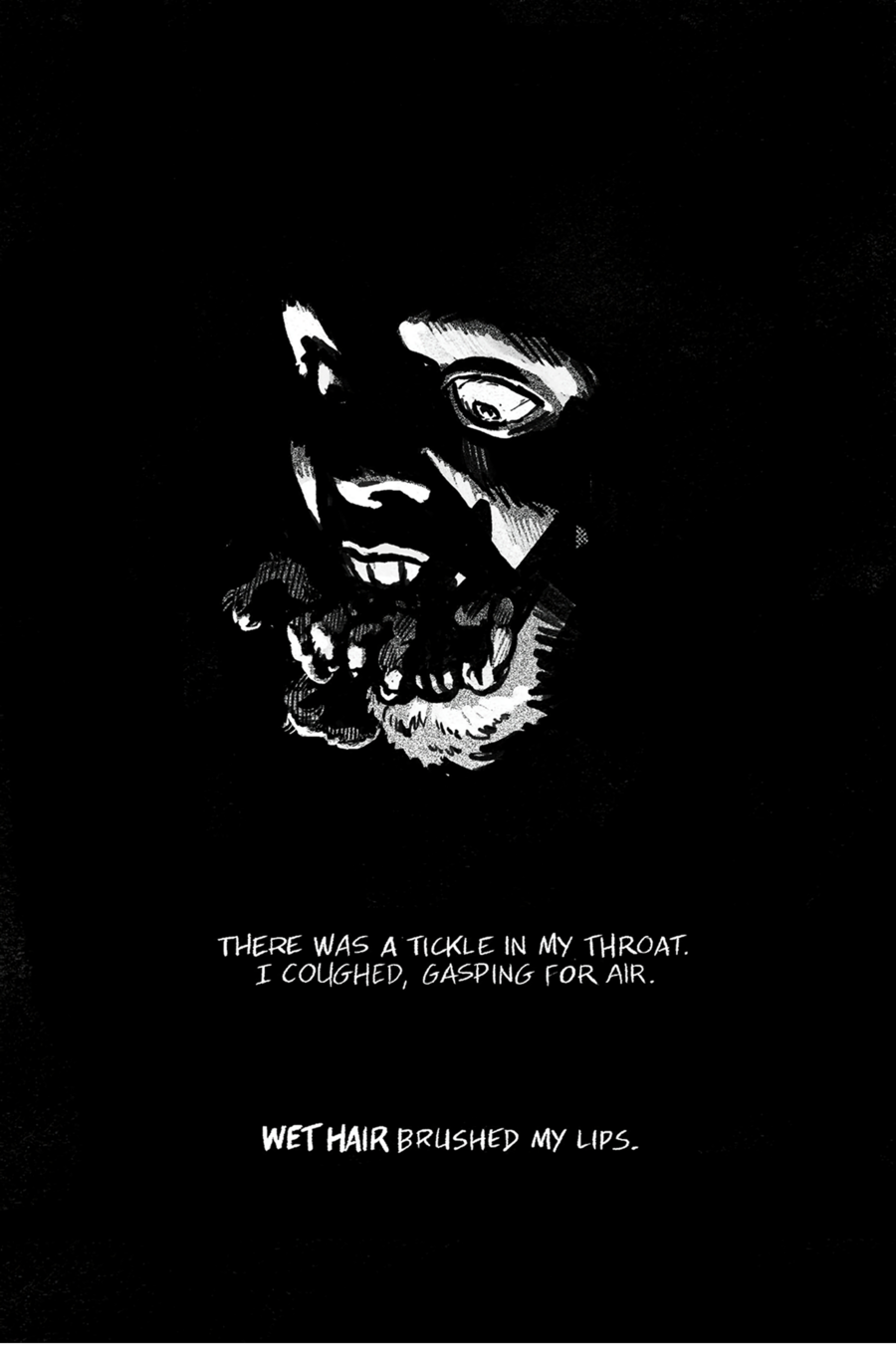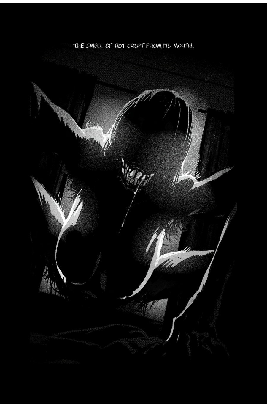 One More Nigh могла бы оказаться в блоке «страх ради страха», но гораздо точнее её читать как историю о разрушительной надежде через метафору боязни монстра под кроватью. Ребёнок убеждает себя, что всё закончится, если он выдержит ещё одну ночь, всего ещё один раз. Фреймы постепенно заполняются звуками скрежета и чёрнотой, зелёный «безопасный» свет сменяется тревожным красно-оранжевым, и вместе с героем читатель осознаёт неотвратимость происходящего. В этом хоррор узнаваем: сколько раз мы сами думали, что нужно просто ещё немного потерпеть: ещё одну ночь, ещё один день, — и станет легче, но ничего не менялось. История превращает этот опыт затянувшегося выжидания в замкнутый круг ужаса, где надежда становится продолжением мучения, а не выходом из него.