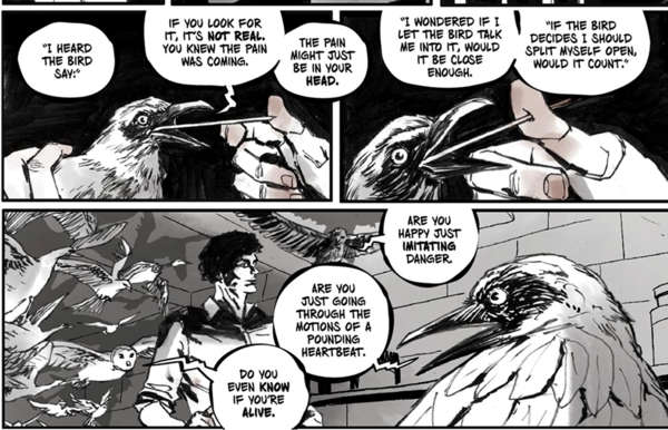 В A Well-Preserved Thing страх возникает из разрыва между тем, что человек думает о себе, и тем, что его тело больше не подтверждает. Таксидермист ежедневно работает с мёртвыми птицами, пытаясь сохранить их жизнь хотя бы визуально, фиксируя форму, позы. Но чем больше он окружает себя этой «сохранённой им же жизнью», тем очевиднее становится: он сам является чучелом человека, не ощущающим ни физической, ни психологической боли. Он режет и протыкает себя, не чувствуя ничего раз за разом, лишь подтверждая то, что он больше мертвый, чем живой.