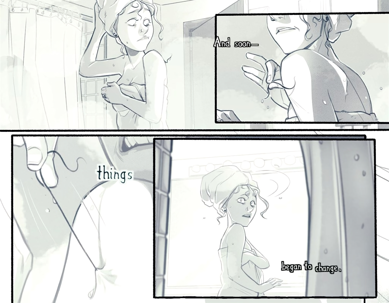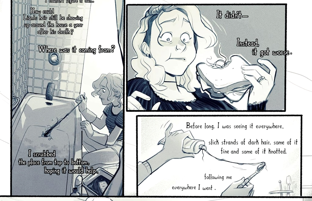 В Strands визуальная деформация напрямую связана с переживанием утраты. Волосы, это бытовой и «мёртвый» материал, который становится материальной формой горя: они начинаются появляться везде, собираются в слова и в конце концов буквально собирают тело покойного мужа. Эта глубокая внутренняя травма потери близкого человека захватывает пространство дома и переписывает реальность под себя. Ужас здесь рождается в том, как горе меняет взгляд и тело: привычный мир медленно превращается в органическую, неправильную среду, к которой ты привыкаешь.