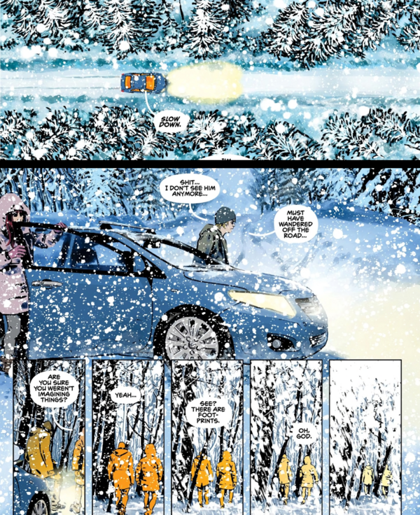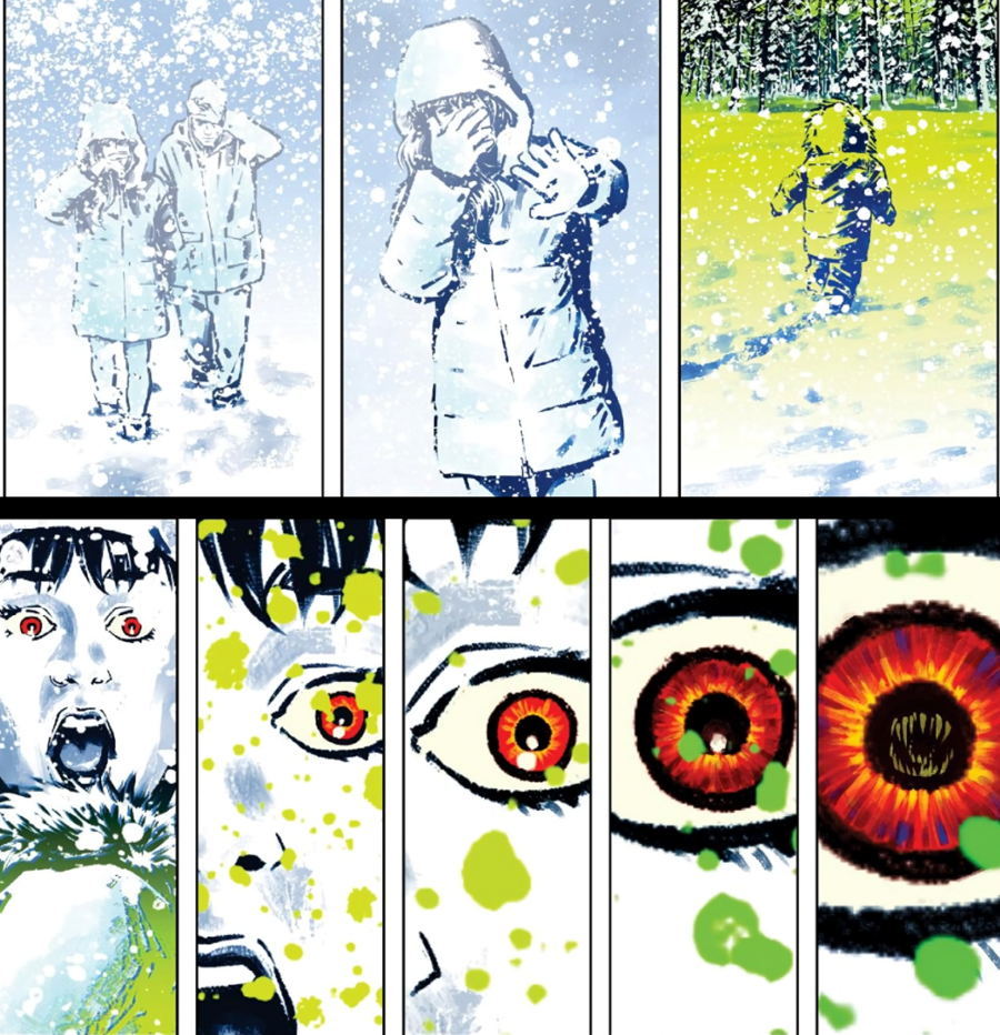 Whiteout даже цвет работает «ради ужаса»: холодный синий снег и белая пустота внезапно ломаются ядовито-зелёными и оранжевыми вспышками, когда появляется существо. Это резкое цветовое изменение не несёт символического смысла, он действует как сенсорный перегруз, который буквально вырывает читателя из спокойной картины и превращает страх в чистое, физическое ощущение.