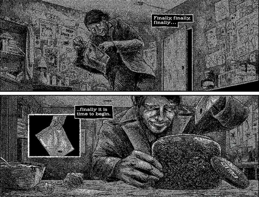 Комикс буквально рассыпается на малые элементы, визуальную маниакальность, становится навязчивой и всепоглощающей. Образ стиральной машины только поддерживает вечное образное цикличное вращение, от убийства к убийству, от звука к звуку. Стиральная машина становится напоминанием о том, что герой не хочет остановить барабан: машина продолжает крутиться и греметь, как материальное напоминание о преступлении. Герой снова и снова вставляет монетку, прокручивая одну и ту же сцену, откладывая разоблачение и ждущие его последствия.