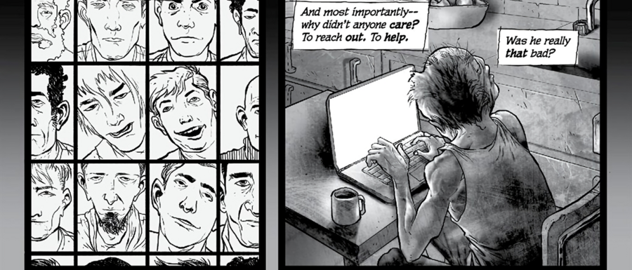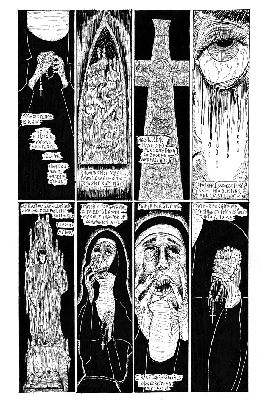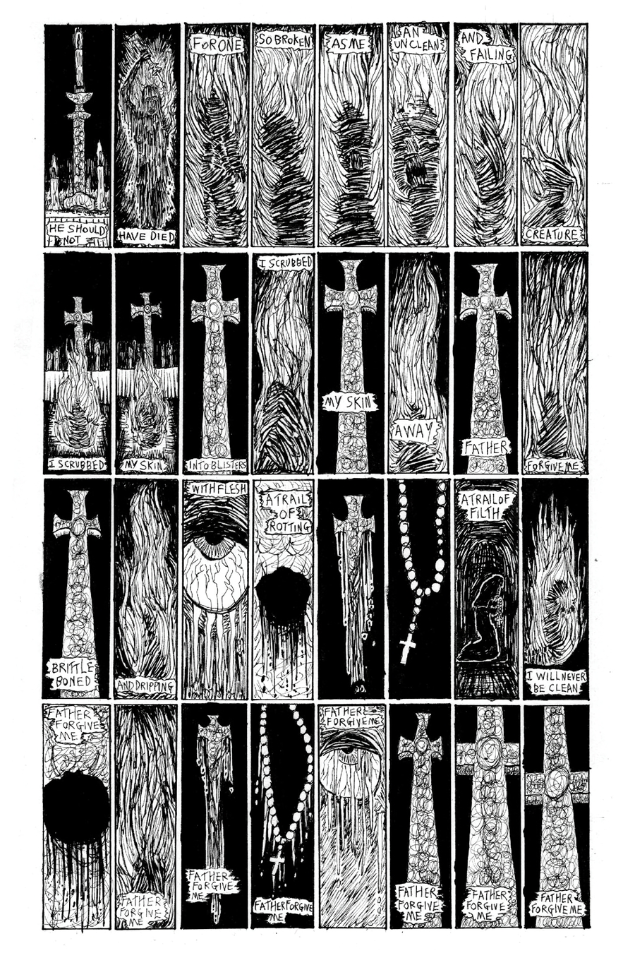 Но именно здесь возникает зона ужаса: стремление быть «правильным» в глазах бога или социального института постепенно становится важнее собственного тела, психики и даже жизни. Желание получить подтверждение своей «нормальности» и чистоты может превратиться в навязчивость, в саморазрушение, в добровольное согласие на насилие. Фреймы сужаются, превращаясь во все более узкие рамки, герой уже не видит ничего вокруг, только крест, который должен принести ему облегчение, но в конце концов читатель понимает, что когда-то фреймы настолько станут узкими, что там не останется места никому и ничему.