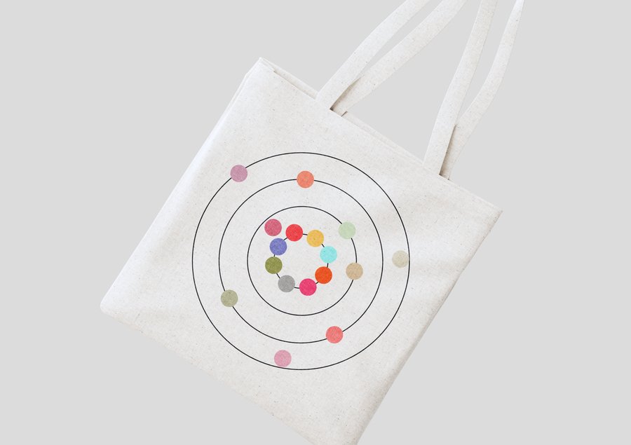 RECRAFT: realistic iphone 15 case product mockup, modern minimalist design, centered logo printed clearly: circles with small colorful dots placed on orbit, clean studio shot
