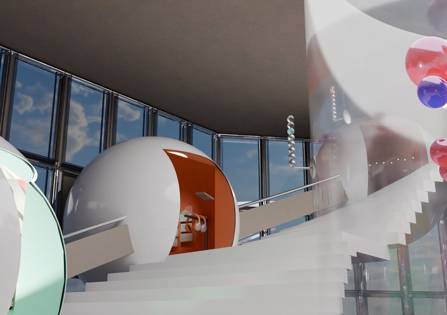 MIDJOURNEY: gallery-like showroom, white walls with colorful interior, central table with arranged products (headphones, music players, vinyls)