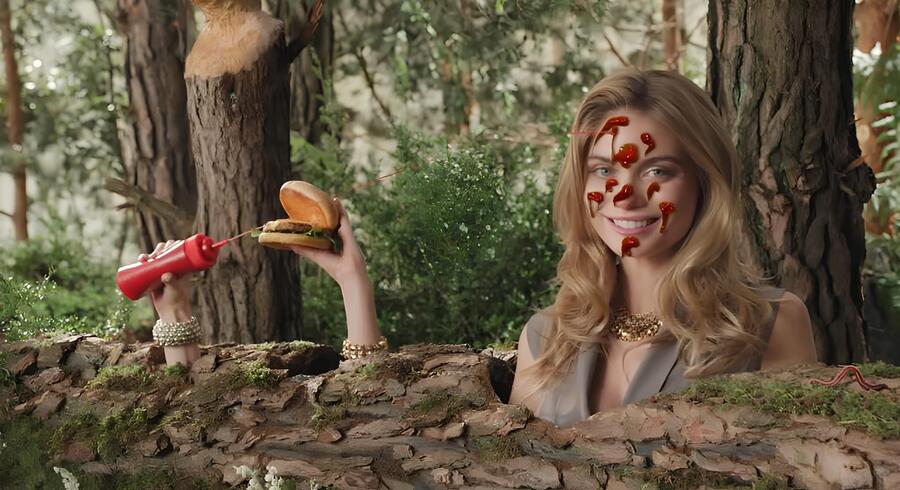 Гигантский батончик Snickers выступает центральным гиперболическим образом. Само сбрасывание батончика в дыру представляет собой абсурдный ритуал.