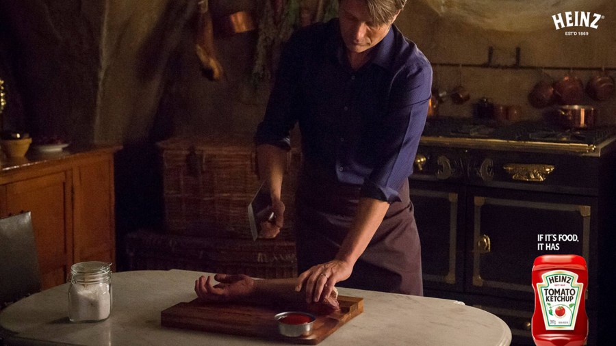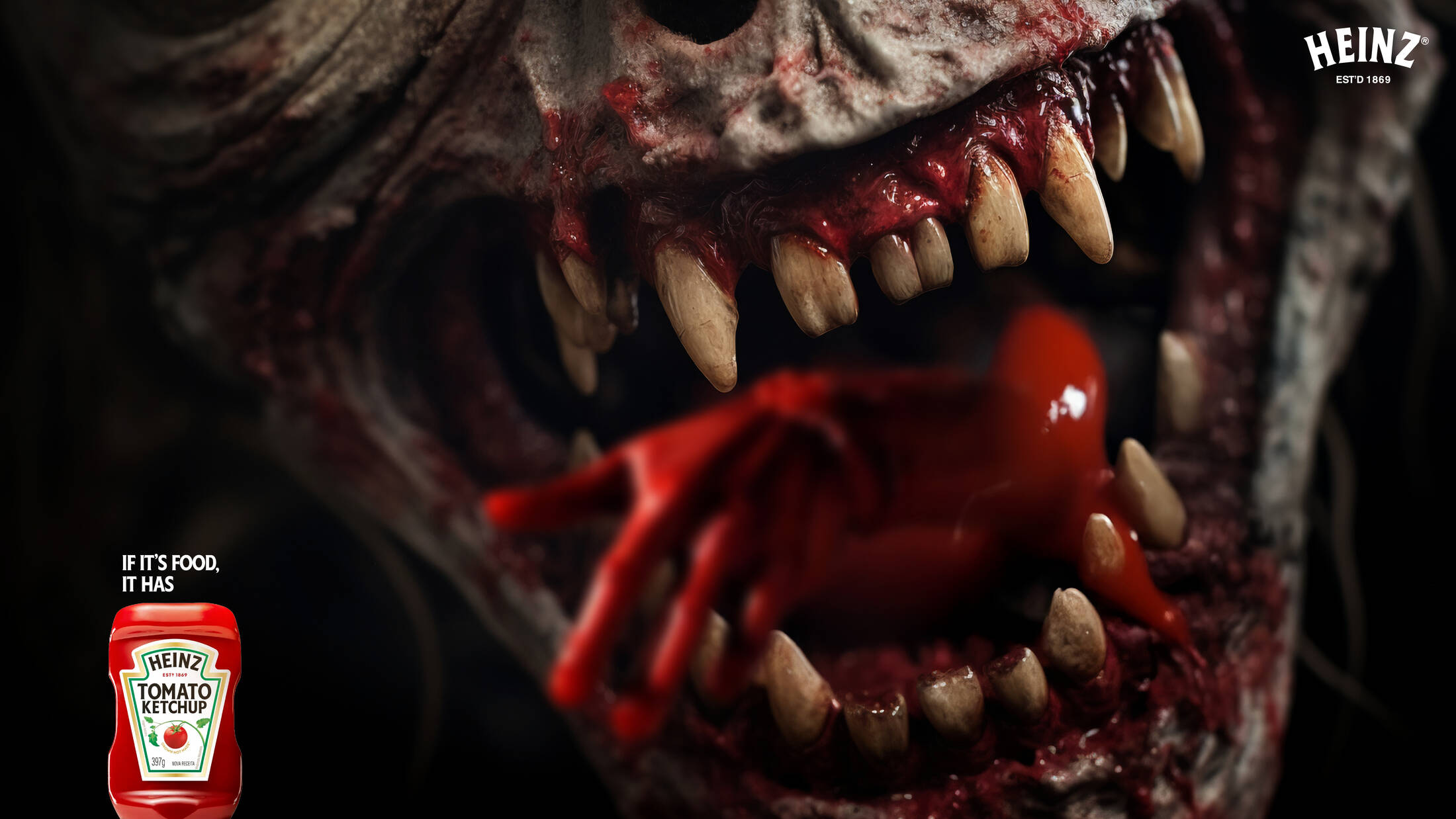 Heinz использует гиперболу — утверждение «Если в нём нет Heinz, это не еда» нарушает ожидания и драматизирует роль соуса, вызывая сильный эмоциональный отклик и делая идею легко запоминающейся.