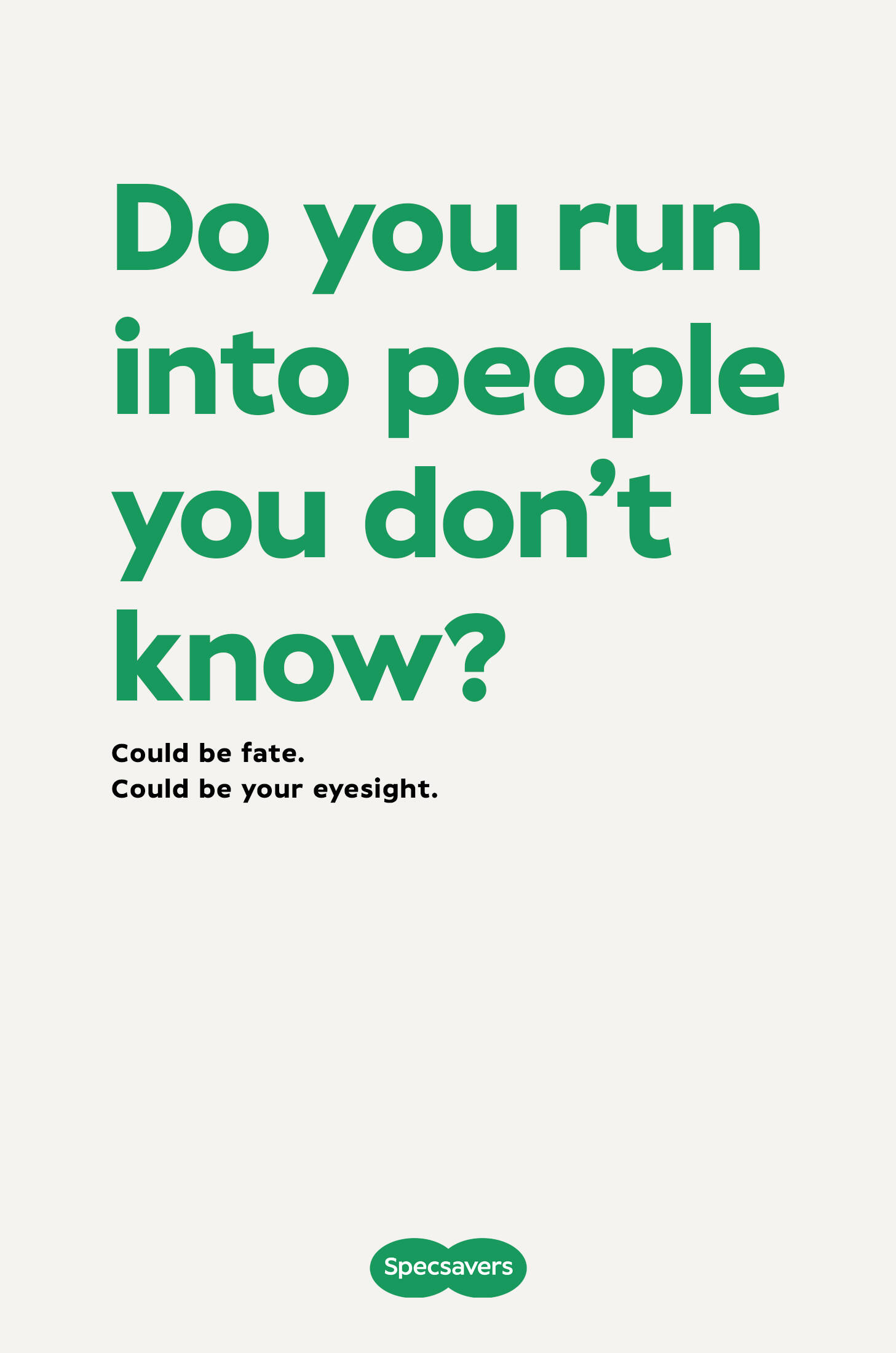 В рекламном плакате Specsavers задается вопрос «Do you run into people you don’t know?», который мгновенно вовлекает читателя. Он обращается к знакомой ситуации — столкновению с незнакомыми людьми. Это персонализирует проблему и заставляет задуматься о собственном опыте.
