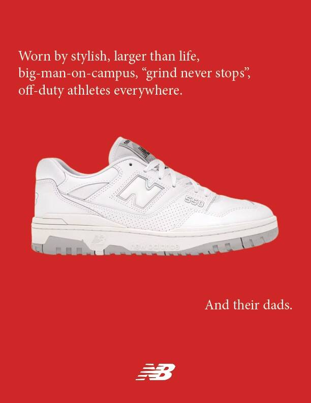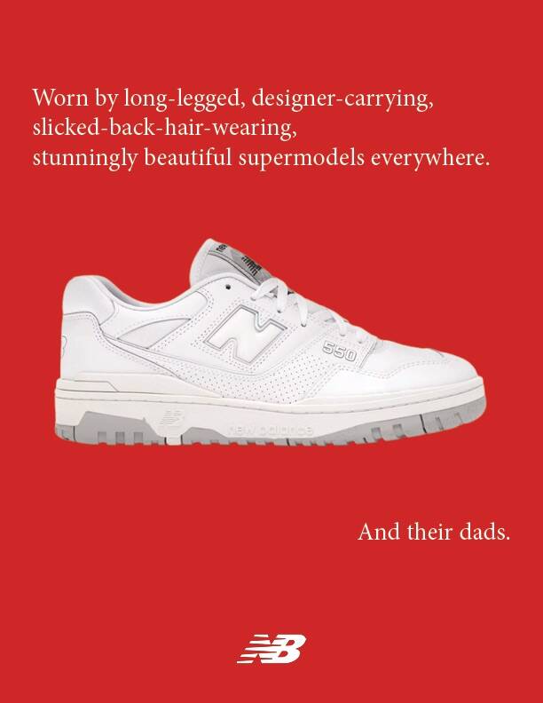 Такой же пример используется и в рекламных постерах New Balance, где благодаря перечислению двух разных, но узнаваемых сегментов аудитории демонстрирует универсальность продукта. Это убеждает потенциального покупателя в том, что обувь актуальна и подходит всем.