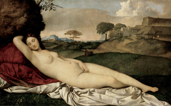 На картине Джорджоне Венера не всемогущая богиня, а скорее нимфа, тихо спящая на фоне идилического пейзажа. Её нагота выглядит естественно. Низкий горизонт акцентирует её красоту, как бы заставляя зрителя преклониться перед ней.