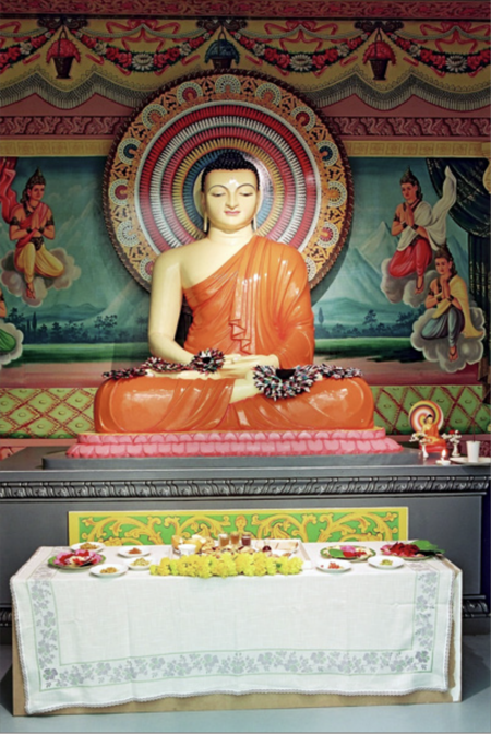 На некоторых алтарях в течение всей выставки дымился благовониями, мерцали свечи, обновлялись подношения — цветы, еда, напитки. Тем самым акцент делался на живом религиозном действии.