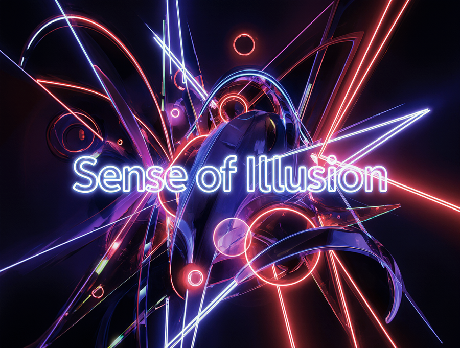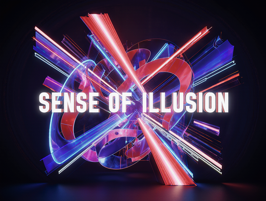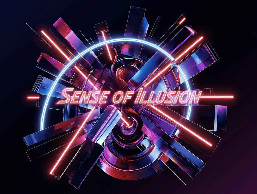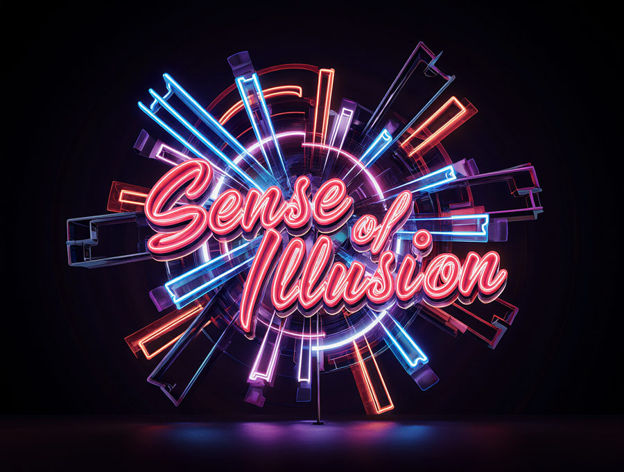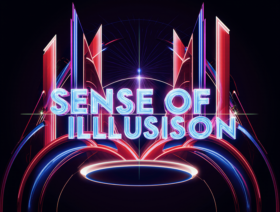 Sophisticated and luxurious logo for an immersive illusion theater, brand name «Sense of Illusion». Abstract geometric design inspired by the bold neon of the reference image. Focus on clean, sharp geometric shapes (e.g., stylized arcs, parallel lines) with layered depth. Color palette: limited to electric blue, vibrant red, and deep purple neon, with stark white luminous outlines. The brand name «Sense of Illusion» should be integrated as a refined element, perhaps in a clean, sans-serif neon font or subtly incorporated into the geometry. Only sence of illusion text, no words anymore. Strong, clean glow effect on a solid black or very dark background. Vector art, minimalist yet dynamic, with a premium feel.