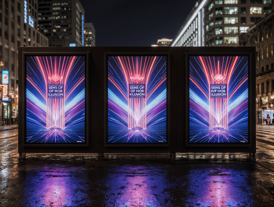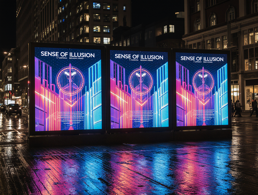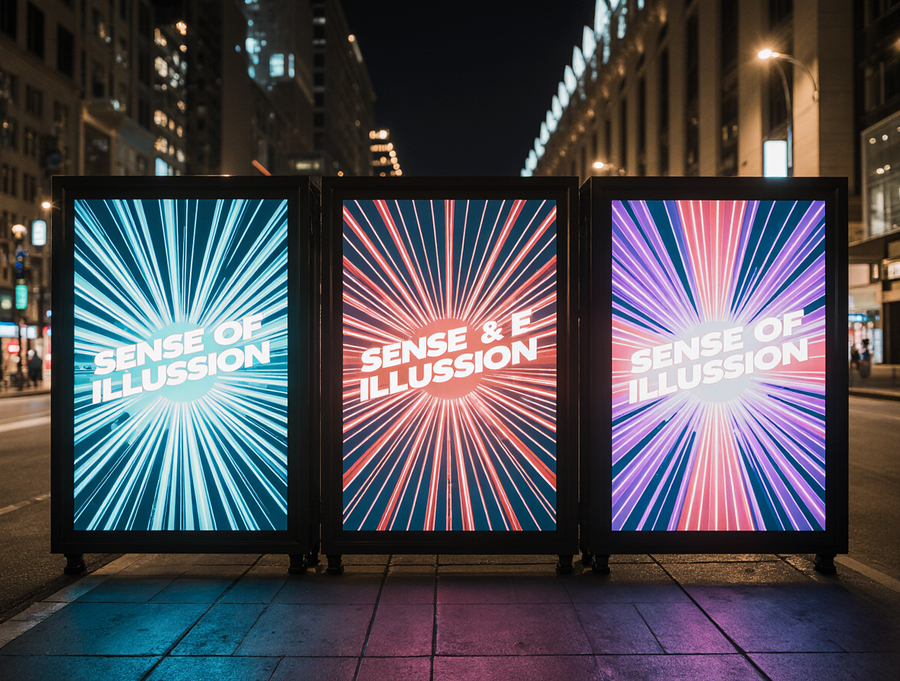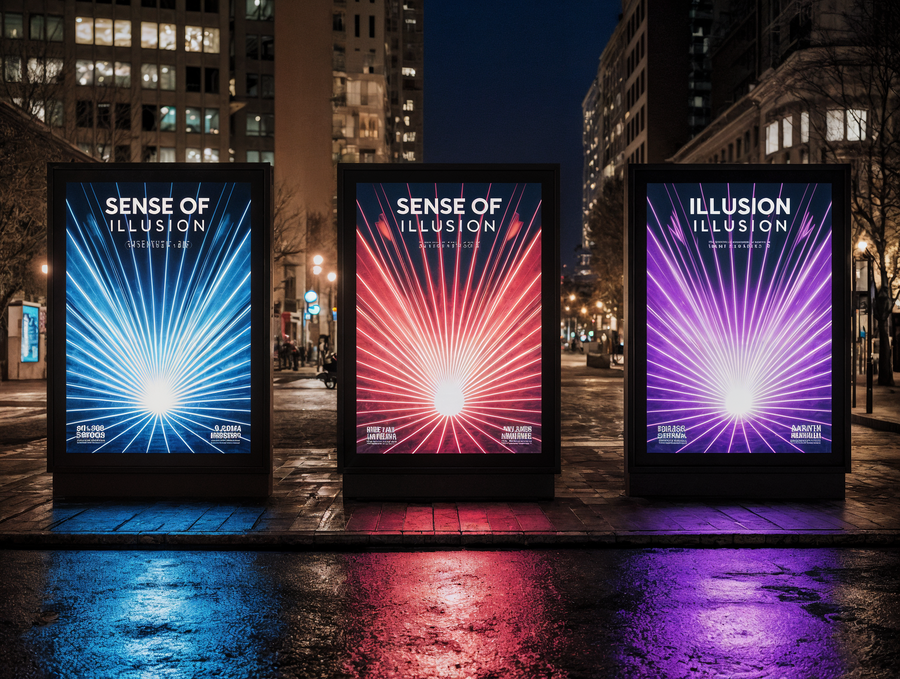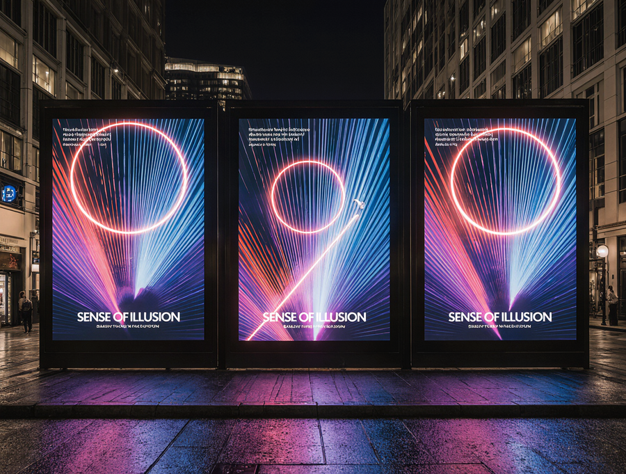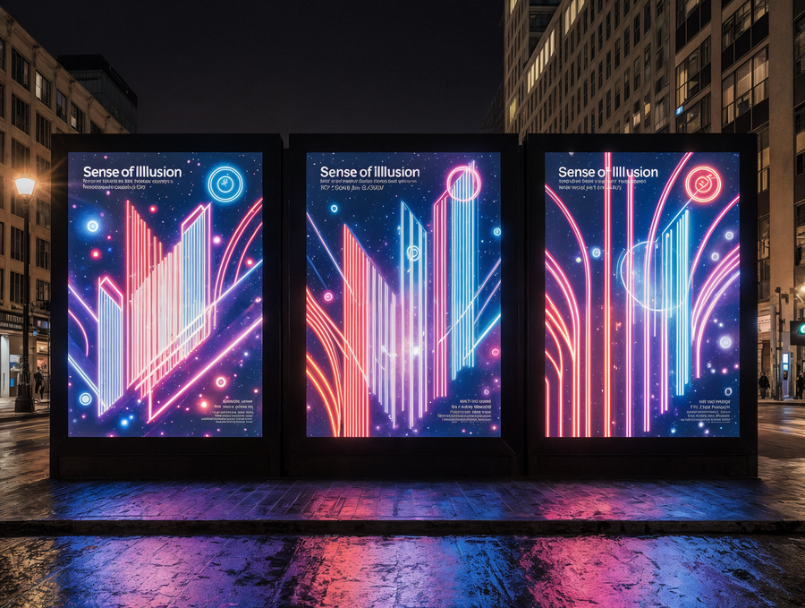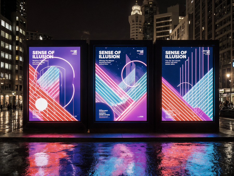 A realistic photograph of a large outdoor street banner displaying three distinct, unified poster designs for the «Sense of Illusion» immersive theater. Each of the three poster designs is an abstract geometric composition, heavily inspired by the vibrant, futuristic neon Art Deco aesthetic of the reference image. They feature intricate layered shapes, sharp angles, dynamic vertical and diagonal lines, glowing circles and arcs, creating a sense of grand spectacle and optical illusion. The primary color palette for all posters is electric blue, radiant red, and deep luminous purple neon, with crisp white glowing outlines and strong volumetric lighting. The luxurious brand name «Sense of Illusion» is prominently integrated into each poster design in a clean, sophisticated neon sans-serif font. The overall banner is seen at night in a bustling, high-end urban environment, with blurred city lights, reflections, and elegant modern architecture in the background. Strong, clean glow effect. Only «Sense of Illusion» text, no other words. Cinematic photography, wide shot, professional advertisement.