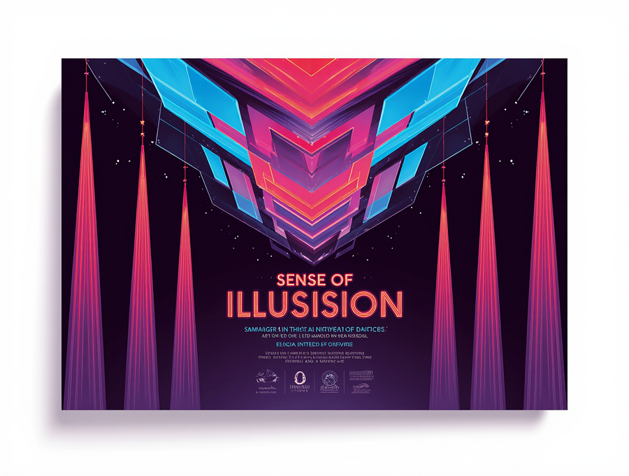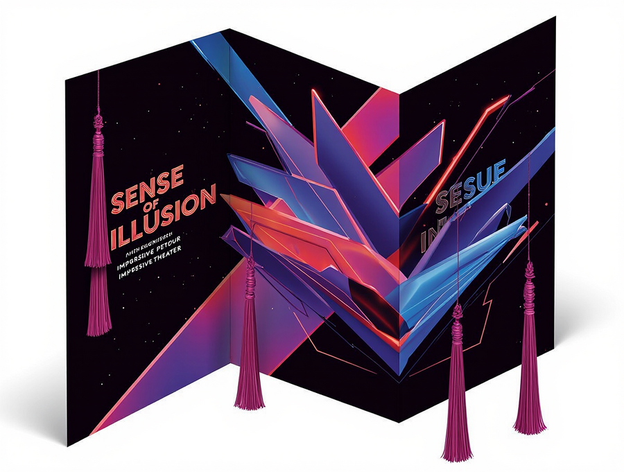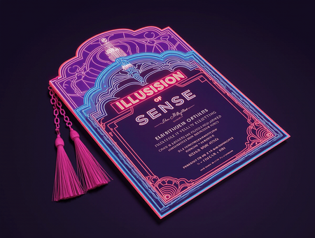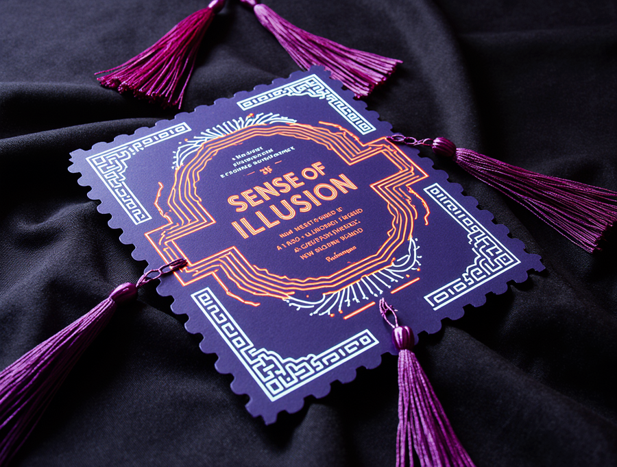 A luxurious and elegant invitation card for the «Sense of Illusion» immersive theater. The card design should mimic the layered, die-cut, and scalloped shape of the reference postcard, but rendered in a vibrant, futuristic neon Art Deco style inspired by the second image. The primary colors are electric blue, radiant red, and deep luminous purple neon, with stark white luminous outlines. Intricate geometric patterns in this neon style should adorn the card’s surface, creating depth and visual interest. The brand name «Sense of Illusion» should be prominently displayed in a clean, sophisticated neon sans-serif font. Crucially, the invitation should feature elegant, cascading magenta or deep purple tassels, similar to the reference postcard, adding a touch of luxury and tactile appeal. The background of the invitation itself should be a deep, solid black or very dark midnight blue to enhance the neon glow. The overall feel should be sophisticated, mysterious, and inviting, evoking a sense of grand spectacle. Vector art, clean lines, high-end design.