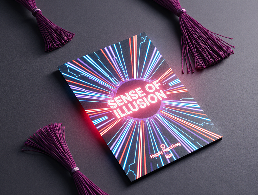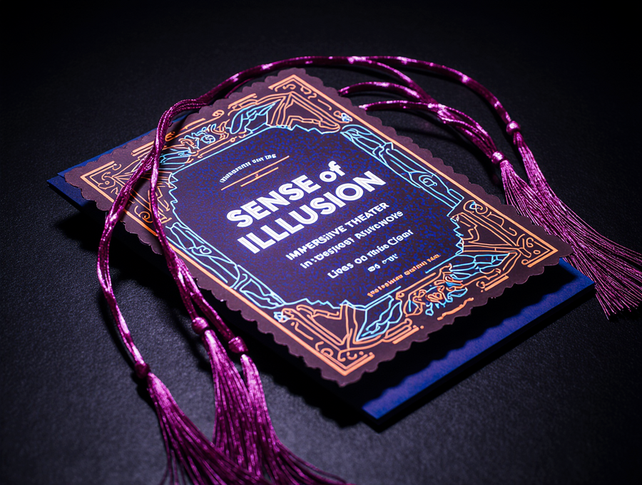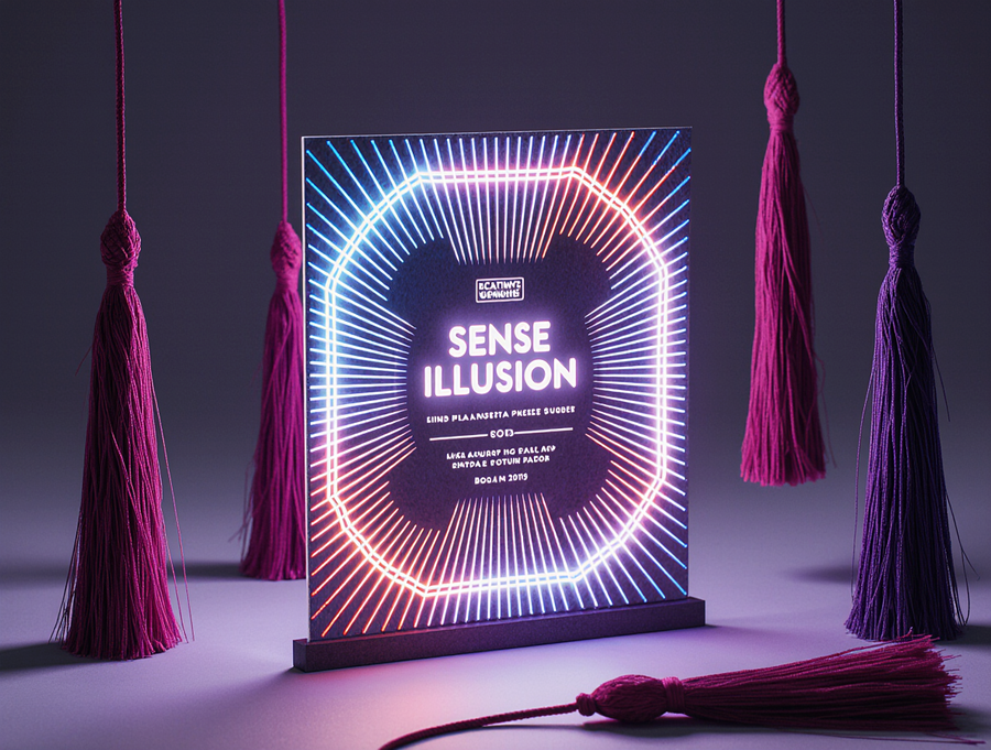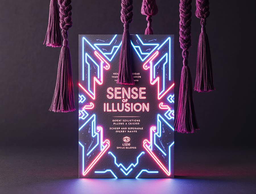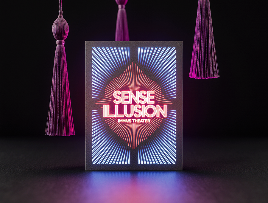 Ultra-realistic, tactile photograph of an invitation for the «Sense of Illusion» immersive theater. The card features a sophisticated die-cut shape with clear layering, made of high-quality, textured cardstock. The design is a vibrant neon Art Deco explosion: electric blue, red, and purple neon geometric patterns with sharp white glowing outlines. The brand name «Sense of Illusion» is in a sleek, neon font, integrated into the design. Hanging from the card are rich magenta or deep plum tassels, rendered with realistic thread detail and catching the light. The scene is set with soft, directional lighting that creates subtle highlights on the neon edges and shadows on the textured paper, giving it a tangible feel. Placed on a dark, slightly reflective surface. Cinematic, high detail, photorealism.