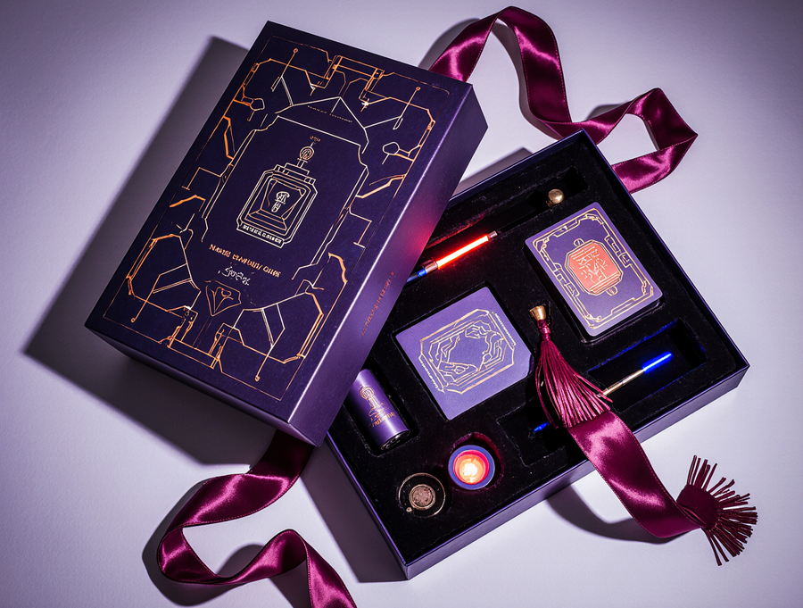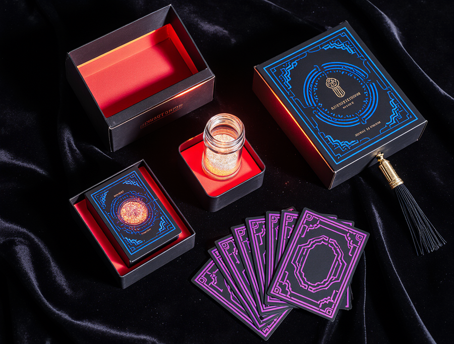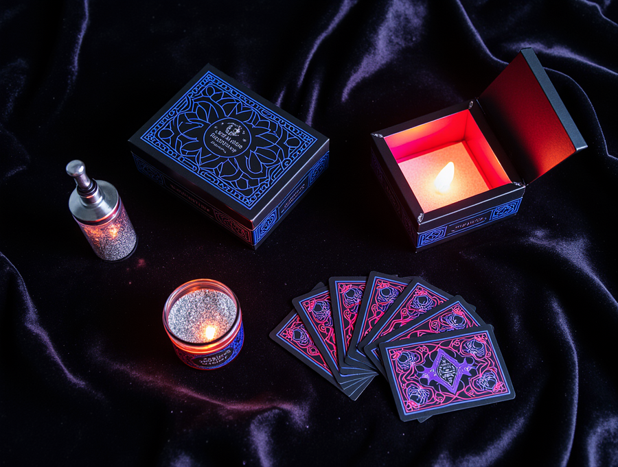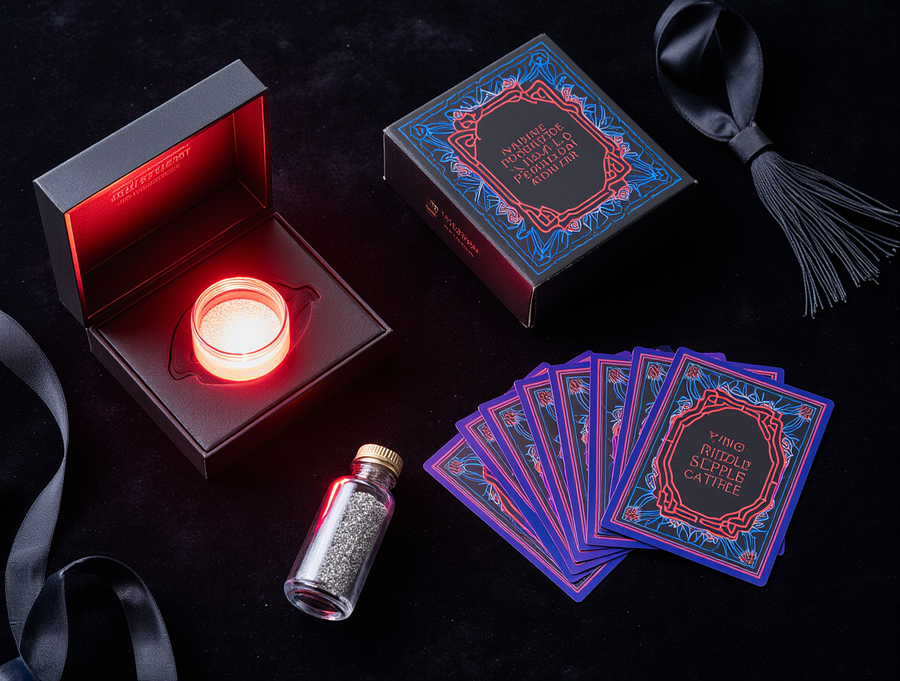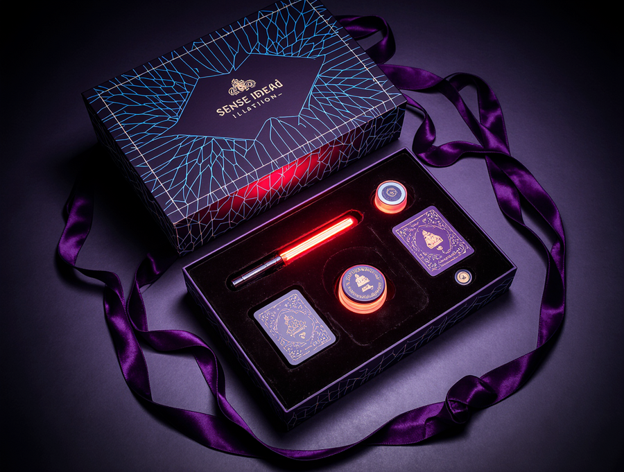 A close-up, top-down view showcasing the exquisite details of a «Sense of Illusion» Master Illusionist’s Kit. The scene focuses on three key items: 1. A small, elegant vial of «Stardust Powder», filled with fine, iridescent glitter that catches the light, its packaging a miniature neon Art Deco cylinder with glowing blue and purple accents. 2. A stylized «Neon Transformer» box, a compact, glossy black cube with electric red neon geometric patterns and a subtle white outline, open to reveal a hint of its internal red glow and perhaps a glimpse of a vanished item. 3. A deck of «Riddle Cards», with their backs displaying intricate neon Art Deco geometric designs in blue, red, and purple, with a shimmering metallic sheen. The cards are presented slightly fanned out on a dark, rich velvet surface. Surrounding these hero items are other luxurious elements: a glimpse of a silk tassel, a hint of the elegant box lining. The overall lighting is dramatic and magical, with focused spotlights on the items, creating highlights and subtle shadows, emphasizing the premium textures (velvet, metallic sheen, glass vial) and the vibrant neon glow. The brand name «Sense of Illusion» is subtly visible on the packaging of each item. Photorealistic, macro details, studio product photography, enchanting atmosphere.