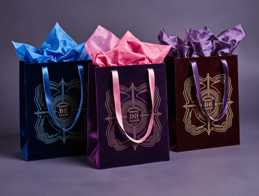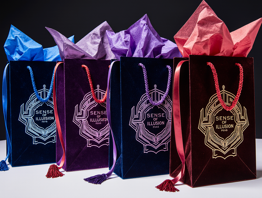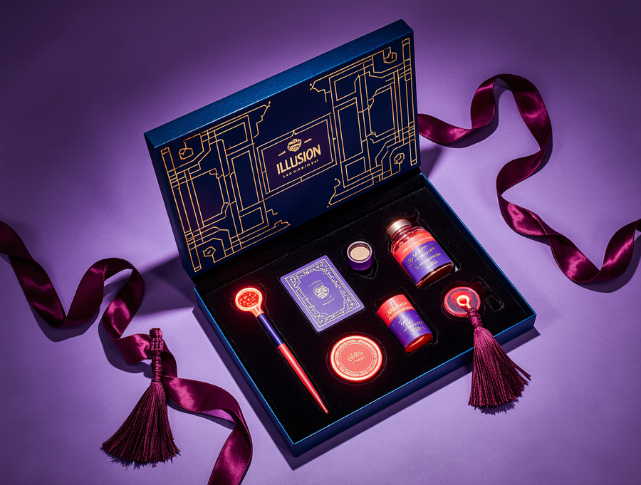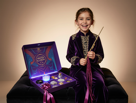 Top-down view of an opened, luxurious, and magical «Sense of Illusion» illusionist’s kit for children. The presentation box is crafted from deep, rich velvet (e.g., royal purple or midnight blue) with an exterior design featuring intricate neon Art Deco geometric patterns in electric blue, vibrant red, and deep purple neon, with stark white luminous outlines, reminiscent of the reference image. The velvet surface of the box is subtly dusted with fine, iridescent «stardust» glitter, and the neon geometric patterns on the exterior have a subtle, shimmering metallic sheen. The lid of the box is open, revealing the meticulously arranged contents. Inside, nestled in custom-cut slots or on a dark velvet lining, are various illusion props: a sleek, stylized neon wand with glowing accents, a deck of «Riddle Cards» with the brand’s geometric motifs, miniature «Color Void» cylinders, a small «Neon Transformer» box with internal red neon glow, and perhaps a delicate «Stardust Powder» vial. Luxurious, cascading magenta or deep purple silk tassels are artistically draped over some of the items or attached to the box’s interior. The overall atmosphere is enchanting, mysterious, and highly polished, with a sense of wonder and premium quality. Subtle ambient lighting creates soft shadows and highlights on the velvet, neon elements, props, and the stardust, enhancing the magical feel. The brand name «Sense of Illusion» is subtly embossed or subtly integrated into the box design. High detail, photorealistic, studio lighting, product photography.