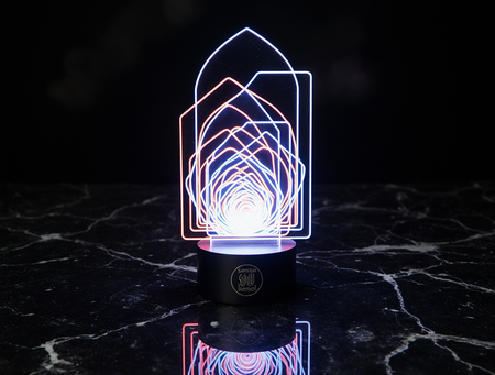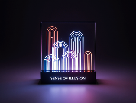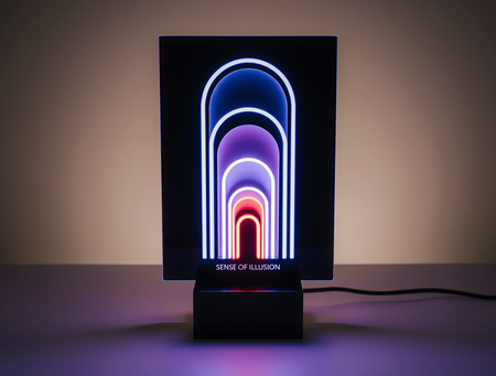 A highly stylized, elegant night light designed in the «Sense of Illusion» brand aesthetic. The night light is abstract and geometric, inspired by Art Deco and futuristic neon designs. It features clean, sharp lines, layered geometric shapes (e.g., arches, sharp angles, circles, parallel vertical elements), reminiscent of the reference image’s architectural motifs. The primary material appears to be a dark, glossy, high-quality acrylic or a similar material, with integrated neon light elements. The neon colors are strictly electric blue, vibrant red, and deep luminous purple, with stark white luminous outlines. The light source should emit a soft, ambient glow, illuminating the geometric forms from within and casting subtle shadows, creating a magical and slightly mysterious atmosphere. The design is minimalist yet impactful. The brand name «Sense of Illusion» could be subtly etched or integrated as a faint neon line. The night light is shown in a dimly lit, modern bedroom setting to emphasize its function and glow. Photorealistic, product photography, focus on design and lighting.