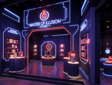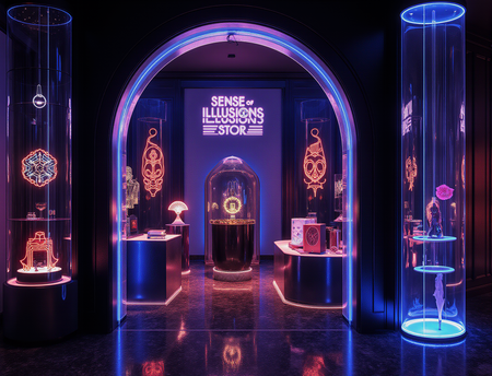The store’s architecture itself plays with optical illusions: floating geometric shapes, impossible angles, walls that seem to shift or change depth, and strategically placed mirrors to create a sense of infinite space. The entrance could be a dramatic archway with a neon «Sense of Illusion Store» sign.