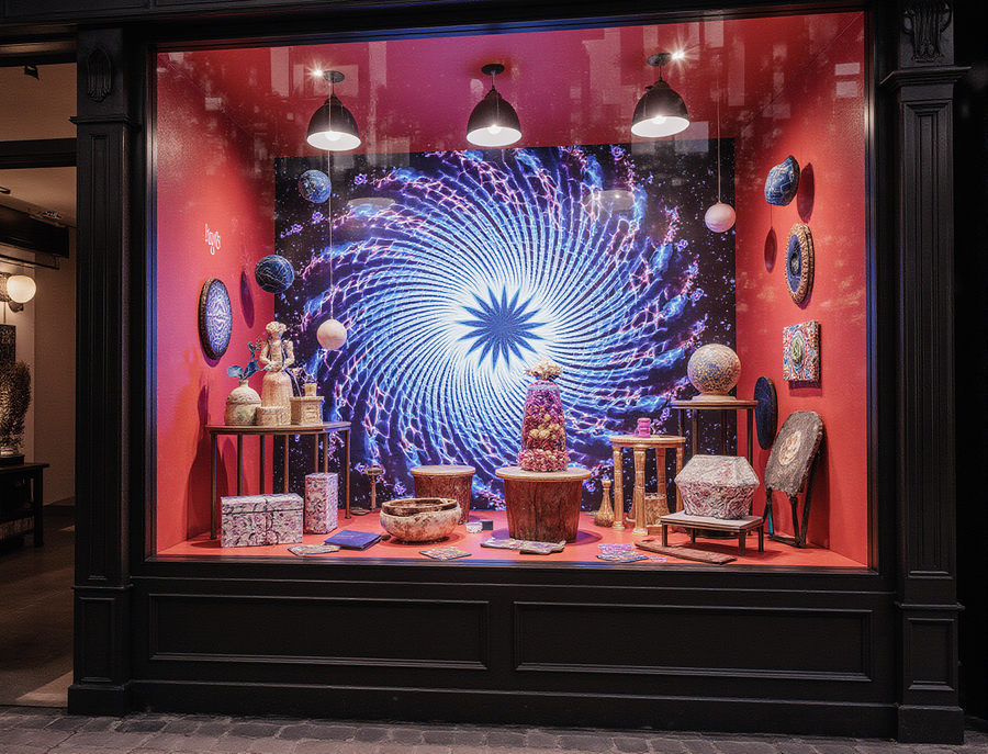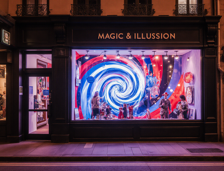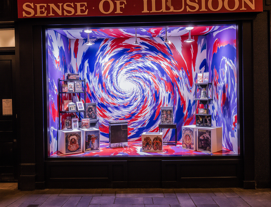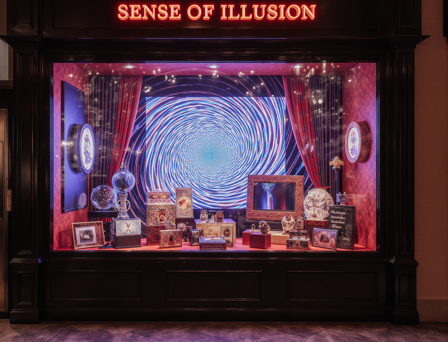 A hyper-realistic, captivating storefront window display for «Sense of Illusion Store», a magic and illusion shop, located on a vibrant city street. The display is richly decorated with elements inspired by the dynamic, neon-like geometric shapes and bold colors (reds, blues, purples) of the first reference image. Prominently integrated into the display is a mesmerizing optical illusion artwork, mirroring the hypnotic swirling blue and white pattern from the second reference image, creating a sense of depth and wonder. The window showcases magical gift sets, mystical curiosities, and interactive illusion props.