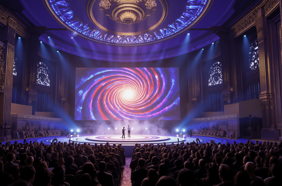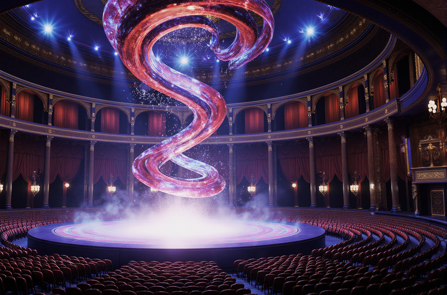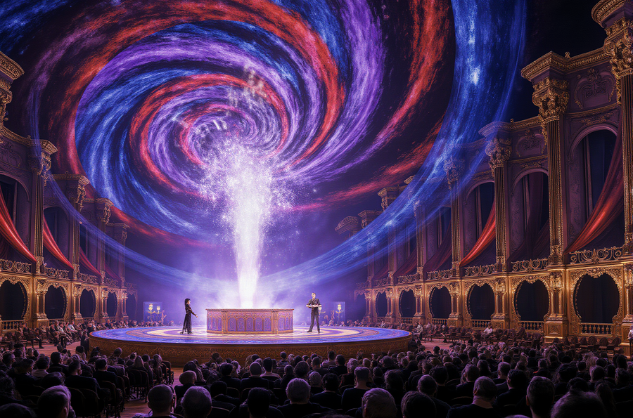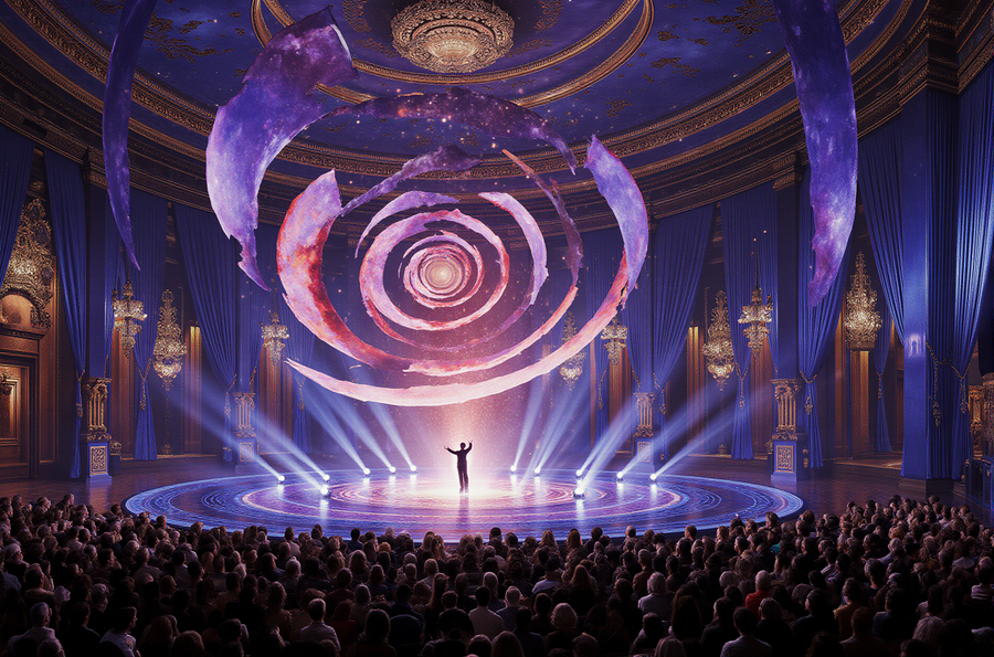 Ultra-realistic, awe-inspiring scene inside a lavish theater of illusions, during a guest performance. The main stage and surrounding architecture are designed with an extravagant, highly stylized aesthetic, drawing heavily from the angular, glowing, and abstract art of the first reference image, rendered in an intense palette of sapphire blues, ruby reds, and amethyst purples. A colossal, mind-altering optical illusion, emulating the disorienting spiral vortex from the second reference image, is projected or built onto the stage, dynamically interacting with the performance. A skilled illusionist captivates the audience with a grand spectacle, accompanied by dramatic lighting, ethereal mist, and bursts of magical energy. The entire venue exudes an air of opulence and wonder, with gilded details and breathtaking scale