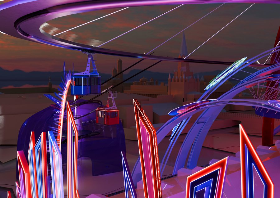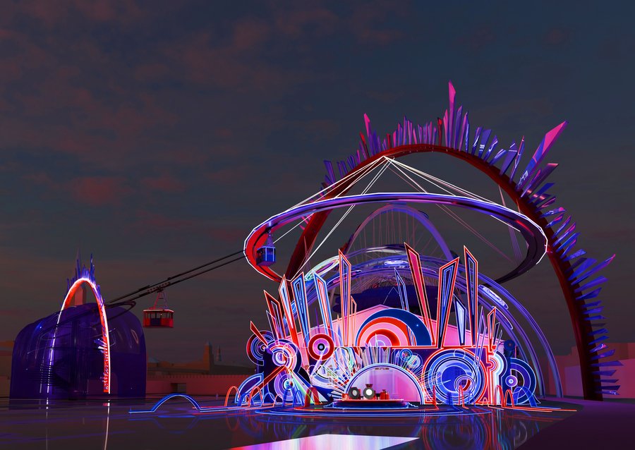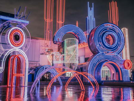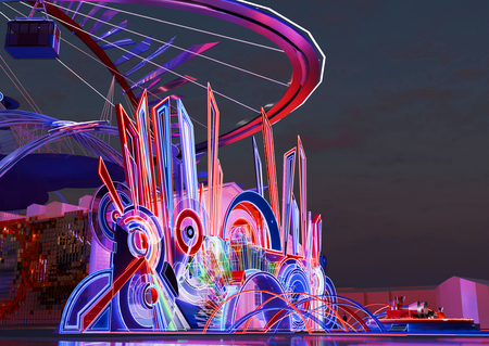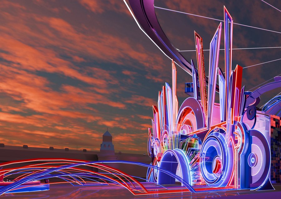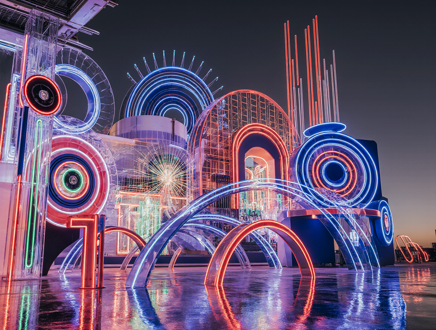 The lighting is dramatic, emphasizing the neon glow and creating illusions of light and shadow. Photorealistic, architectural visualization, high detail, immersive experience.
