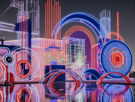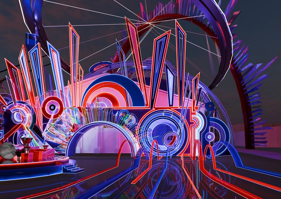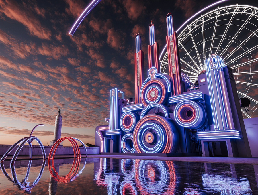 A hyper-realistic, complex and abstract architectural installation with a strong Art Deco influence, rendered with vibrant neon lights. The composition features a dynamic interplay of sharp geometric shapes, bold curves, concentric circles, and angular lines, in a striking palette of electric blue, vivid red, deep purple, and bright white neon. The structure includes elements that resemble futuristic frameworks, archways, and layered planes. The surface is highly reflective, with a glossy, wet-like floor mirroring the neon lights and geometric forms. The background is a dark, atmospheric sky.
