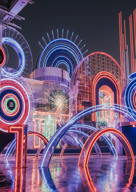 An awe-inspiring, unique, and incredibly beautiful pop-up store called «Sense of Illusion Store». The store is a temporary, immersive retail experience designed with a luxurious, futuristic neon Art Deco aesthetic, directly inspired by the vibrant, architectural motifs. The entire structure is bathed in an enchanting glow, featuring sharp, dynamic geometric lines, layered shapes, and glowing neon elements in electric blue, vibrant red, and deep luminous purple, with stark white luminous outlines.