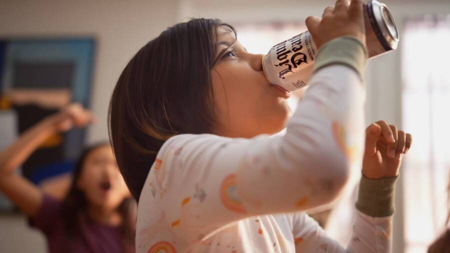 Бренд: Liquid Death, 2022 Формат: видеоролик Суть: рекламный ролик: дети ведут себя как взрослые на пьяной вечеринке, пилотируют банки Liquid Death, дизайн банки напоминает пивную. Финальный слоган: «Don’t be scared. It’s just water» («Не пугайтесь. Это просто вода»).