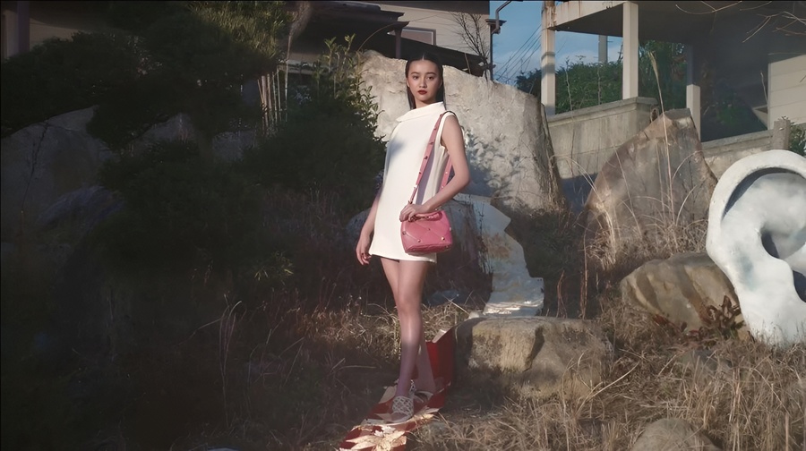 Бренд: Valentino, 2021 Формат: фотосессия / рекламная кампания Суть: модель ходит и сидит на ткани, напоминающей оби — традиционный пояс японского кимоно.