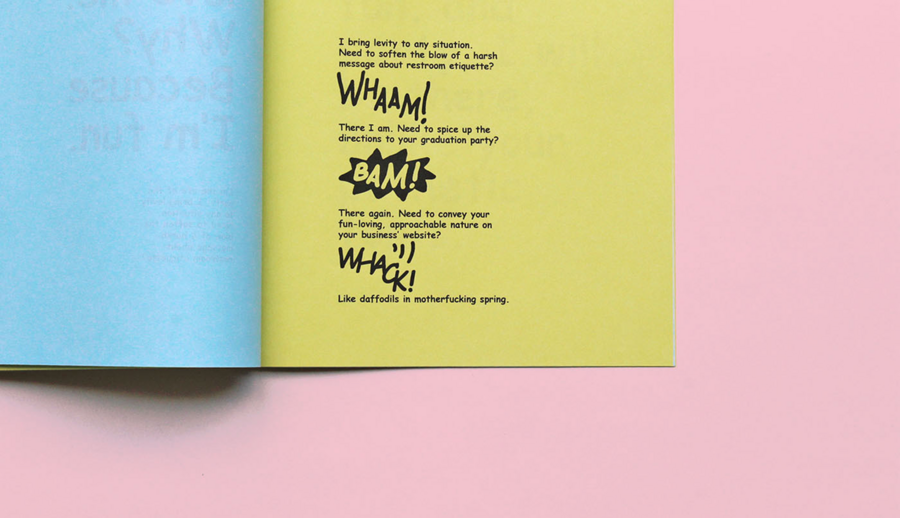 В контексте арт-книги Comic Sans работает как провокация: он заставляет зрителя осознать свои предубеждения относительно «правильного» и «неправильного» шрифта. Это не просто включение «плохой гарнитуры», а художественный инструмент, который демонстрирует культурные стереотипы и смещает внимание с личных предпочтений на структуру визуального языка.