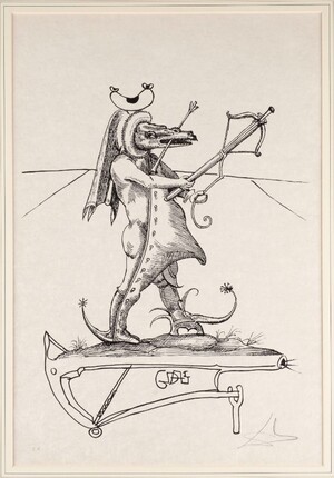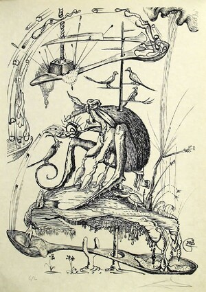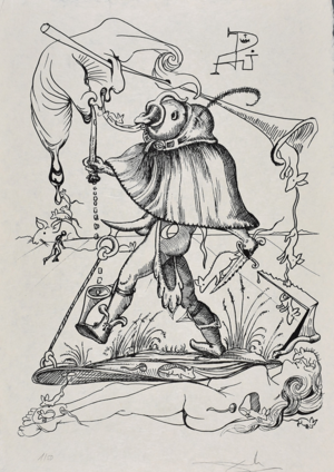 Так, в серии графических работ «Озорные сны Пантагрюэля» явственно прослеживается влияние Босха — мы видим причудливые гибридные существа, олицетворяющие в карикатурной манере различные грехи из романа Франсуа Рабле «Гаргантюа и Пантагрюэль». Дали как график менее известен, чем Дали как живописец, тем интереснее мне было изучить его графические рисунки. Дали здесь виртуозно высмеивает человеческие грехи, такие как чревоугодие, жадность, лень и другие. Персонажи этой серии работ очень напоминают монстров с поучительных картин Босха, где художник также создает безумные образы и сложную систему аллегорий, высмеивая человеческие слабости и предостерегая людей от грехопадения.