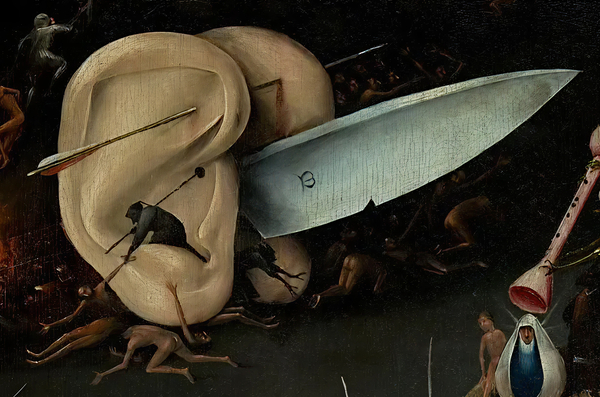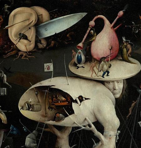 В своих работах Босх часто акцентирует тему человеческой плоти, при чем помимо изображения обычных человеческих тел на его полотнах можно встретить причудливые части тела, живущие будто бы отдельной от тела жизнью, например, два огромных уха, скрепленных шпилькой, на правой створке «Сада земных наслаждений», или голова со ступнями и без туловища с картины Босха «Страшный суд».