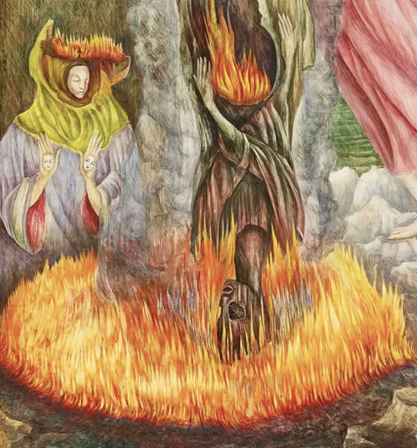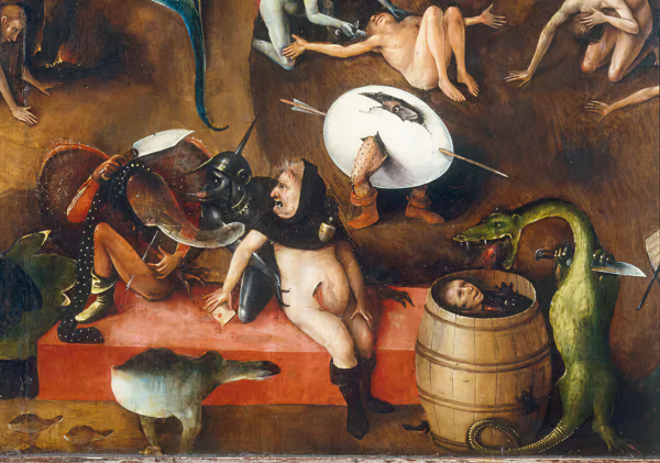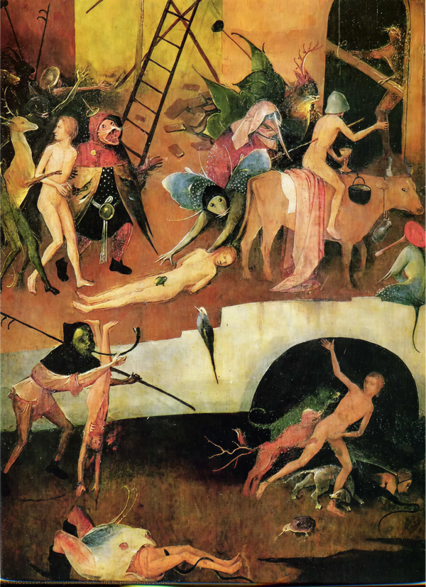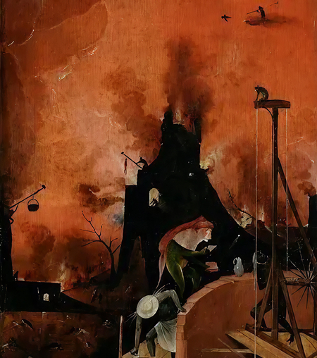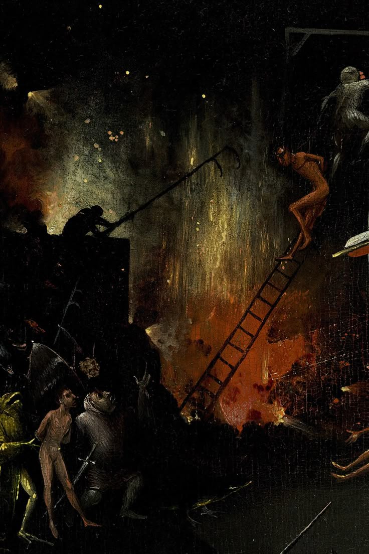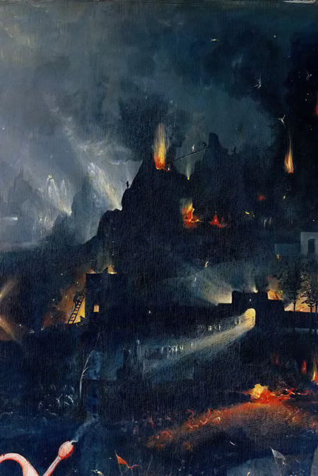 У Босха огонь как правило полыхает в аду и символизирует наказание за грехи и очищение души. Босх — мастер создания пугающих образов ада, огонь у нидерландского гения и буквально символ разрушения, и напоминание о Страшном Суде.