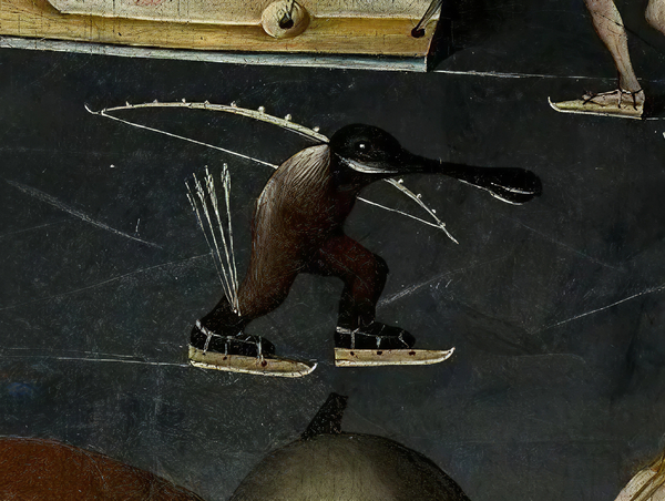 На фрагменте картины Босха мы видим жуткую фигуру получеловека-полуптицы, пожирающего людей. Историки искусства сходятся во мнении, что этот персонаж — олицетворение самого дьявола. [7] У Леоноры Карингтон есть две картины с похожими сюжетами — «Птичьи ванночки» и «Птичники из Бернли».