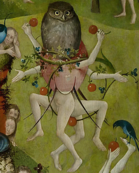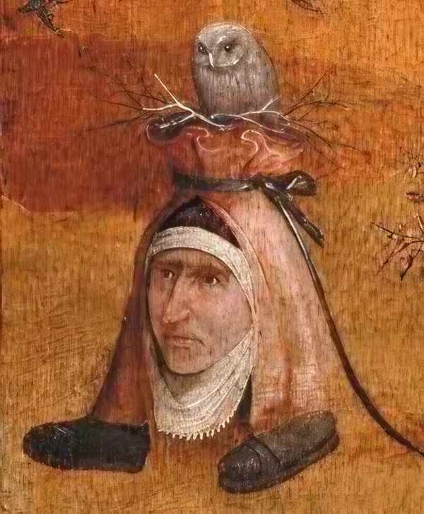Еще один частый сюжет картин Босха — изображение совы. [2] На всех его картинах совы написаны в реалистичной манере и зорко наблюдают за нами. У сегодняшнего зрителя сова, как правило, ассоциируется с мудростью, однако, во времена Босха совы символизировали темные силы, ночь, колдовство, нечто зловещее.