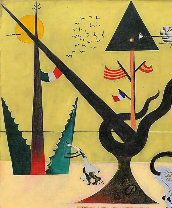 Жоан Миро, «Собака, лающая на Луну», 1926 // Иероним Босх, «Сад земных наслаждений», фрагмент, 1500-е