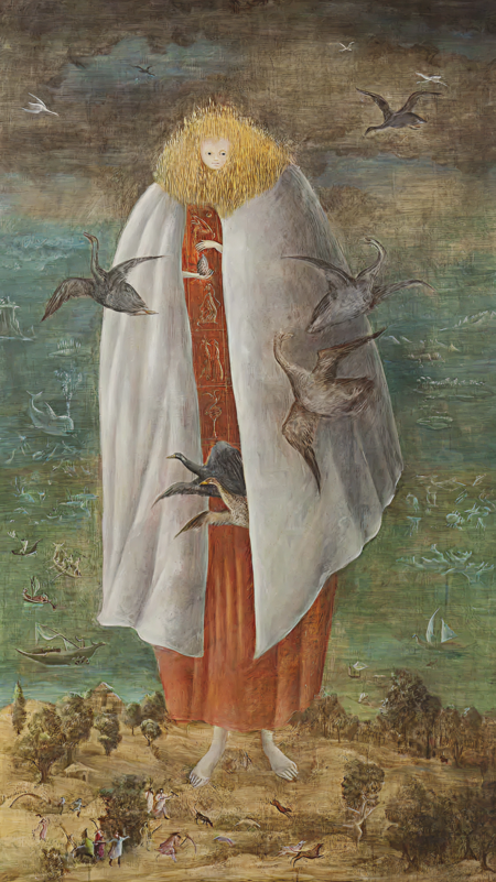 Великанша на картине Леоноры Каррингтон бережно держит в руках яйцо, в окружении загадочных птиц, рыб и охотников у ее ног. Здесь это символ новой жизни, эволюции, точка, в которой соединяется прошлое, настоящее и будущее.