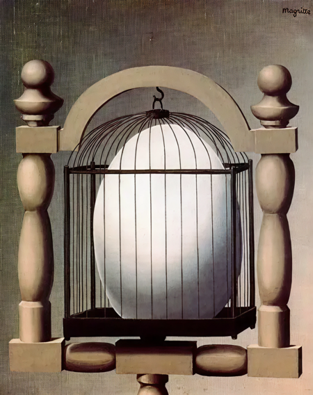 Яйцо на картине Магритта «Избирательные сходства» заперто в клетку. Этот образ вызывает двойственные чувства, у Магритта всегда все нелогично, он загадывает нам загадку. Если в клетке есть яйцо, то где же птица?
