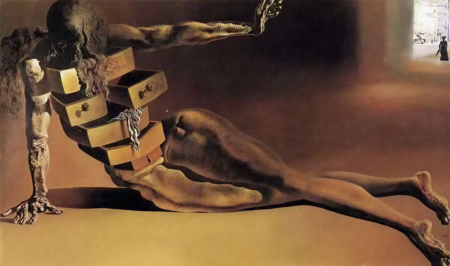Это особенно видно на картине Сальвадора Дали «Человекообразный комод» — лицо человека закрыто от нас, а его тело содержит множество открытых ящичков. Судя по позе этого человека, он страдает. Ящики открыты и пусты, словно его ограбили. Вероятно, они символизируют отчаяние и опустошенность человека, его внутренний мир словно вывернут наизнанку. Сдержанная цветовая гамма также созвучна цветам на картинах Босха, изображающим адские муки и страдания.