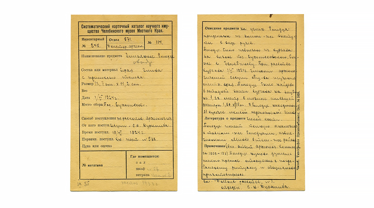 Инвентарная карточка из фондов Челябинского краеведческого музея представляет собой типовой бланк начала 1920-х годов, появившийся после вхождения местной типографии в состав Промбинадта (не ранее декабря 1923 года). Этот формат карточек был частью обновлённой системы учёта музейных предметов, разработанной уже в советский период.